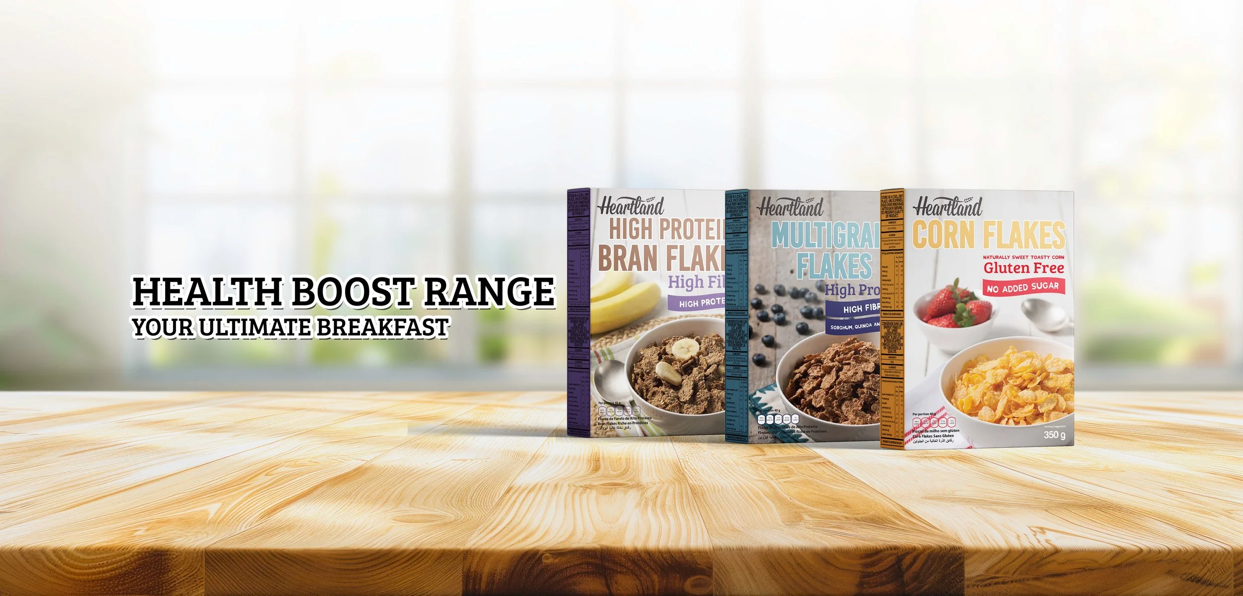 Box of Heartland high protein bran flakes cereal with a bowl of bran flakes topped with banana slices and a spoon, 350 grams